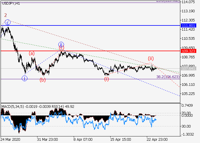 价格继续在全面“三角”模式内,并移动到其下边界,位于4月4日的低点。技术指标显示可能会持续下跌。鳄鱼线指数的指数移动平均线波动幅度扩大,呈下降趋势,AO振荡器图柱在做空区,保持在零水平以下。
