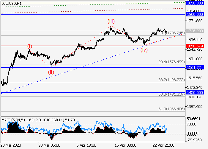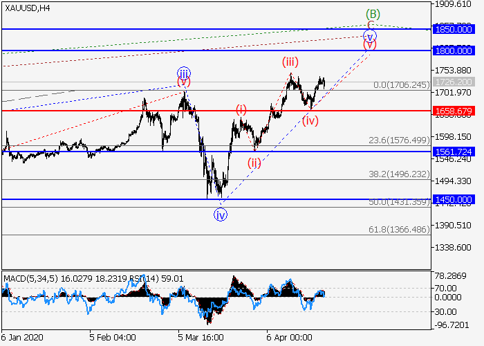 4小时图中,较高水平的上行修正形成为波(C),其中(B)的波C在发展。目前,C的较低水平v的第五波正在发展,其中v的局部修正波(iv)已结束,v的波(v)正在形成。如果假设正确,价格将会升至1800.00–1850.00。该情况的关键止损水平为1658.67。