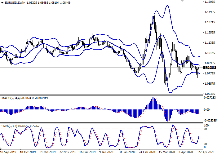 日线图中,布林带呈平面动态。价格范围在相当宽的边界内盘整,符合观察到的市场动态。平滑异同移动平均线指标正在增长,保持弱买入信号(位于信号线之上)。随机指数保持坚定上升趋势,大约在其区域中心。