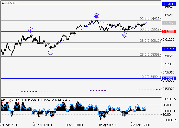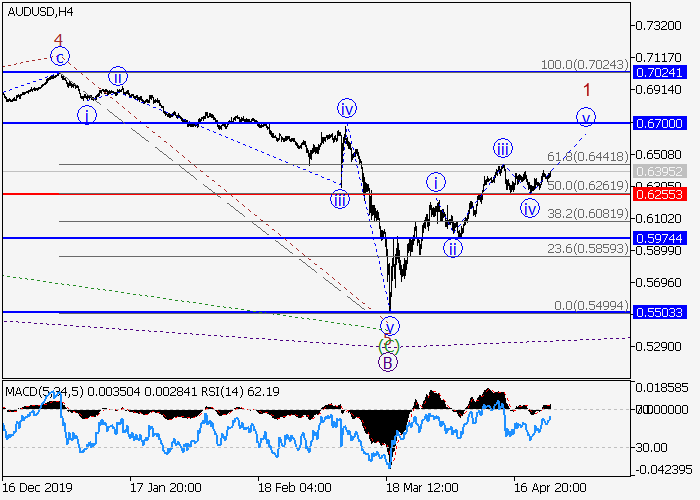 4小时图中,B的较高水平(C)的下行波已发展,其中(C)的波5已形成。目前,C的(1)的较低水平1的第一波已形成,其中1的波v已开始发展。如果假设正确,价格将会升至0.6700–0.7024。该情况的关键止损水平为0.6255。