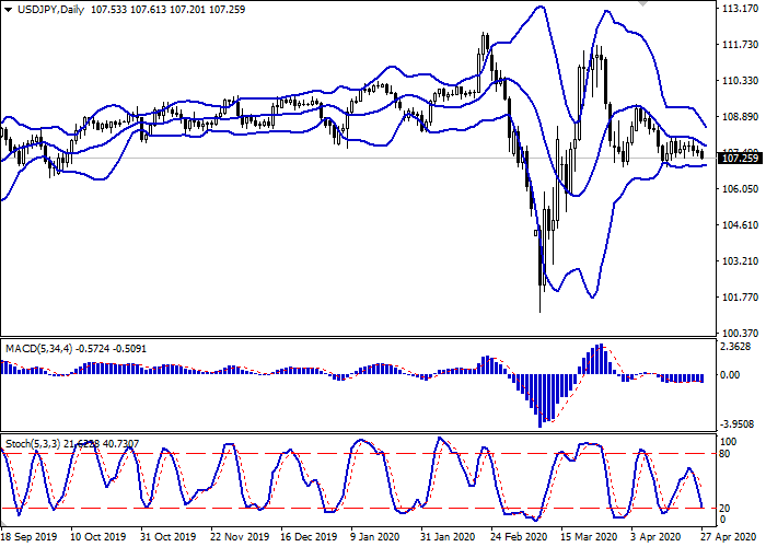 日线图中,布林带略有下降。价格区间正在收窄,反映出短期内交易的不确定性。平滑异同移动平均线下跌,保持弱卖出信号(位于信号线以下)。随机指标呈比较坚定的负面动态,但正迅速接近其最低水平,这表明美元在短期内存在超卖风险。