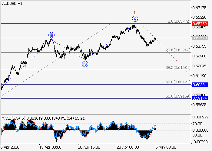 4小时图中,B的较高水平(C)的下行波已发展,其中(C)的波5已形成。目前,(1)的较低水平1的第一波已形成,下行修正作为(1)的波2已开始发展。如果假设正确,价格将会继续跌至0.6038–0.5917。该情况的关键止损水平为0.6575。