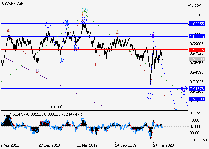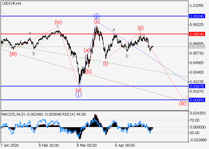 日线图中,(3)的较高水平3的第三波正在发展,其中3的波i已形成,修正结束为3的波ii。目前,3的波iii已开始发展,其中局部修正已完成为3的较低水平(ii)波。如果假设正确,价格可能会跌至0.9167–0.9000。该情况的关键止损水平为0.9804。