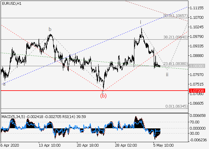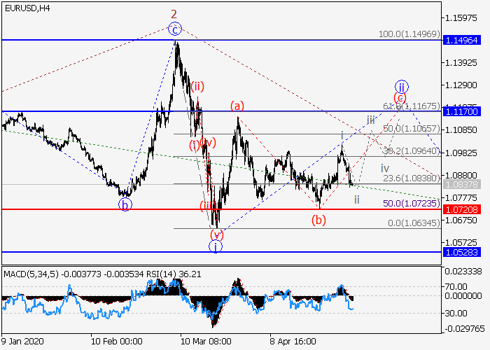 4小时图中,较高水平3的第三个下行波在发展,其中3的第一波i已形成,上行修正发展为3的波ii。目前,ii的波(b)已形成,ii的波(c)正在发展。如果假设正确,价格将会升至1.1170–1.1496。该情况的关键止损水平为1.0720。