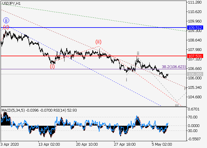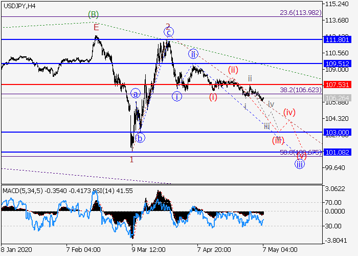 4小时图中,较高水平的下行波(C)已开始发展,其中的局部修正2已形成,(C)的波3正在发展。目前,3的较低水平iii的第三波正在形成,其中iii的波(iii)正在发展。如果假设正确,价格将会继续跌至103.00–101.08。该情况的关键止损水平为107.53。