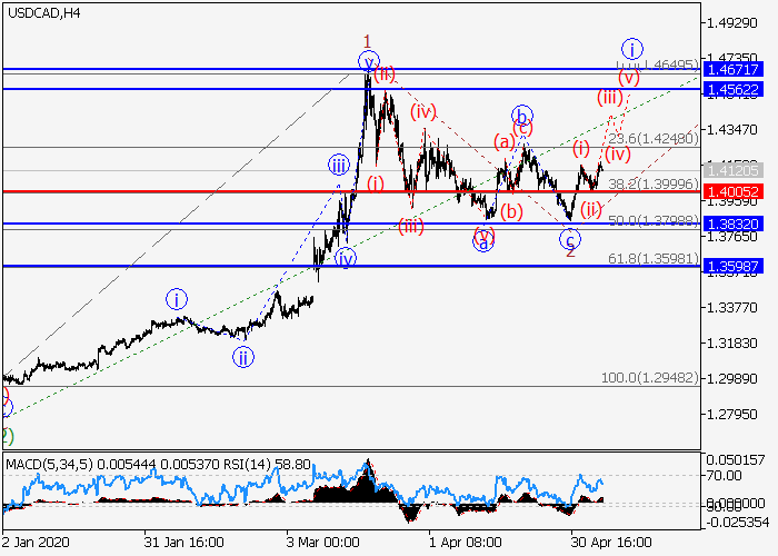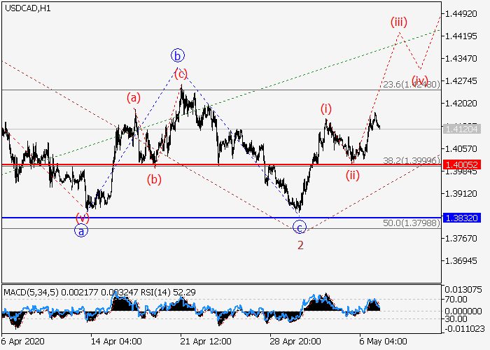 4小时途中,较高水平(3)的第三波继续发展,其中(3)的第一波1已形成,下行修正作为(3)的第二波2已发展。目前,(3)的第三波3已开始形成,其中包含3的i的较低水平(iii)的第三波。如果假设正确,价格将会继续升至1.4562–1.4671。该情况的关键止损水平为1.4005。