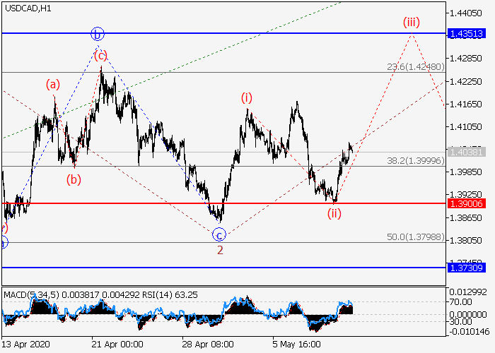 4小时图中,较高水平(3)的第三波继续发展,其中(3)的第一波1已形成,下行修正作为(3)的第二波2已发展。目前,(3)的第三波3已开始形成,其中3的i的较低水平(i)的第一个入市波已形成,3的i的局部修正(ii)已完成,i的波(iii)已开始发展。如果假设正确,价格将会继续升至1.4351–1.4562。该情况的关键止损水平为1.3900。