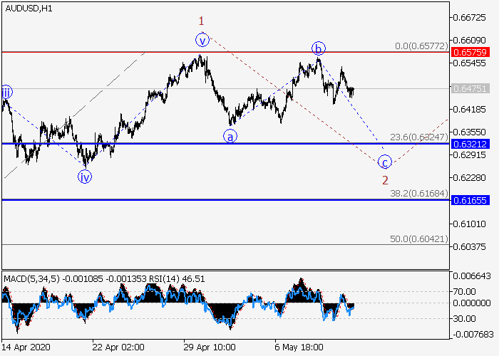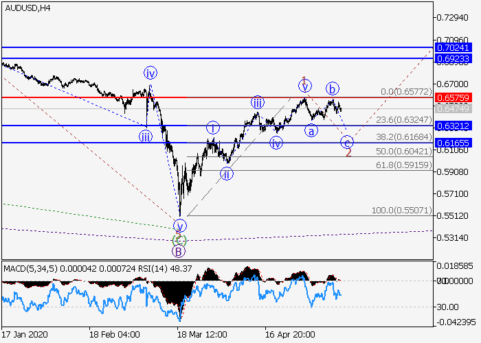 4小时图中,B的较高水平(C)的下行波已发展,上行波C已开始形成。目前,C的(1)的较低水平1的第一波已形成,下行修正正发展为(1)的波2。如果假设正确,价格将会跌至0.6321–0.6165。该情况的关键止损水平为0.6575。