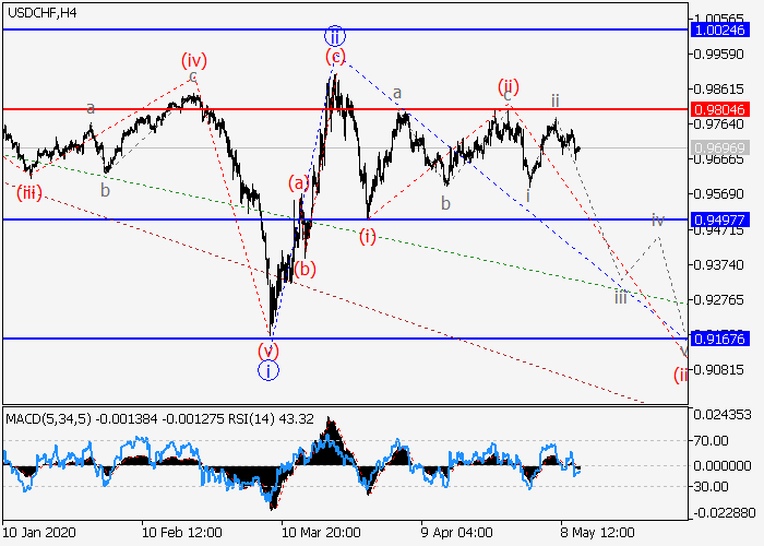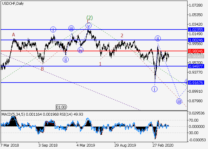 日线图中,(3)的较高水平3的第三波在发展,其中3的波i已形成,修正已结束为3的波ii。目前,3的较低水平iii波已开始发展,其中局部修正已形成为3的iii的波(ii)。如果假设正确,价格将会跌至0.9497–0.9167。该情况的关键止损水平为0.9804。