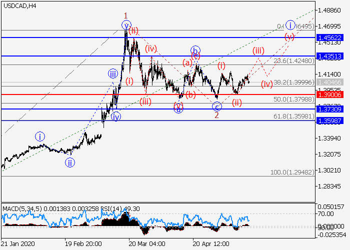 4小时图中,较高水平(3)的第三波在发展,其中(3)的第一波1已形成,下行修正已发展为(3)的第二波2。目前,(3)的第三波3已开始形成,其中3的i的局部修正(ii)已结束,i的波(iii)正在发展。如果假设正确,价格将会升至1.4351–1.4562。该情况的关键止损水平为1.3900。