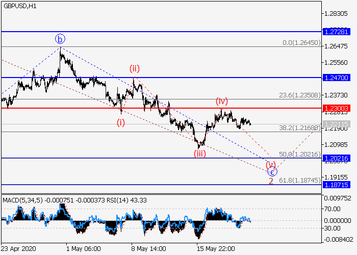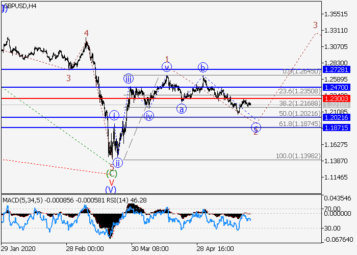 4小时图中,V的(C)的较高水平5的第五个下行波已发展,第一波(1)已开始形成,其中(1)的较低水平1波已形成,(1)的波2正在发展。目前,2的波c正在形成,其中局部修正已结束为c的波(iv)。如果假设正确,价格将会在c的波(v)内跌至 1.2021–1.1871。该情况的关键止损水平为1.2300。