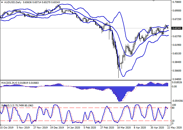 日线图上,布林带在水平面反向。价格范围在相当狭窄的范围内盘整,完全符合观察到的市场动态。平滑异同移动平均线指数下行反转,但仍保持买入信号(图柱位于信号线之上)。随机指标也呈类似动态,在接近80水平时下行反转。