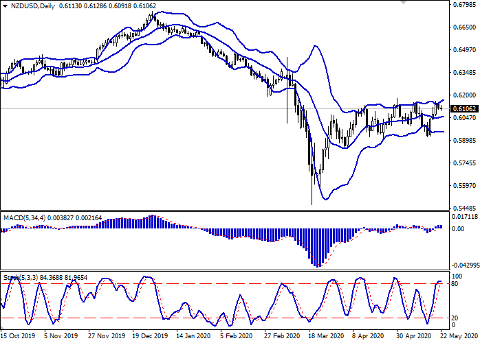 日线图中,布林带略有上涨。价格区间由上开始扩大,为看涨趋势打开可通往局部新高的通道。平滑异同移动平均线指标正在增长,保持弱买入信号(位于信号线之上)。随机指标在接近其高点后,正在向水平方向反转,表示新西兰元在超短期内有超买的风险。