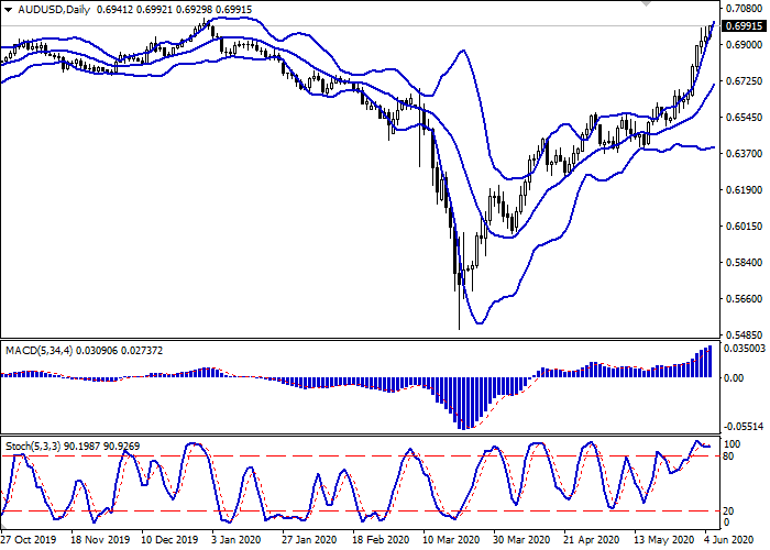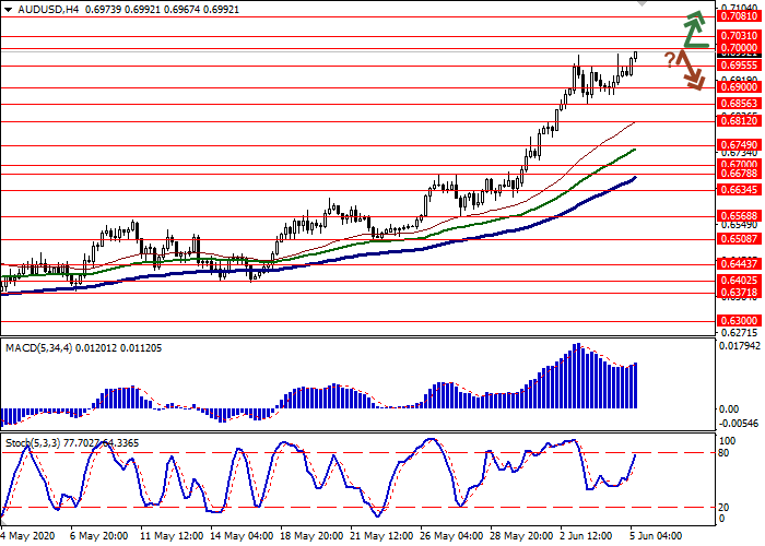 价格突破0.7000水平时,可以开设多头头寸。获利水平为0.7081–0.7100。止损水平为0.6940。实施期:1-2天。