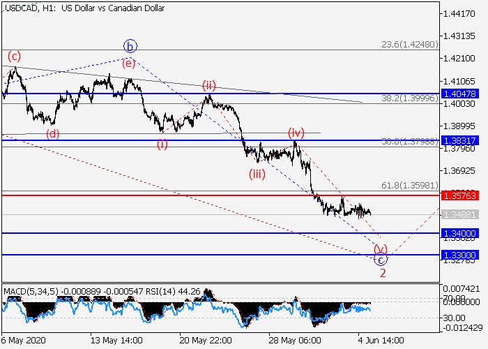 4小时图中,较高水平(3)的第三波在发展,其中下行修正发展为(3)的第二波2。目前,2的波c正在发展,其中c的波(v)正在形成。如果假设正确,价格将会跌至1.3400–1.3300。该情况的关键止损水平为1.3576。