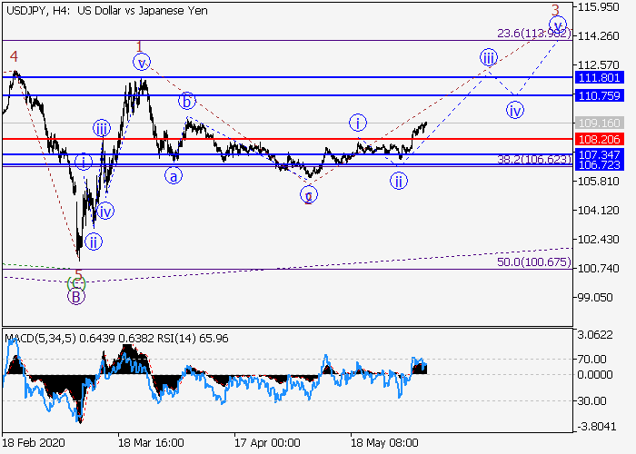 4小时图中,较高水平的上行波C在发展,其中C的(1)的第一波1已形成,修正发展为(1)的波2,(1)的波3已开始形成。目前,3的较低水平i的第一个入市波已形成,3的局部修正ii已结束,3的波iii正在发展。如果假设正确,价格将会升至110.75–111.80。该情况的关键止损水平为108.20。