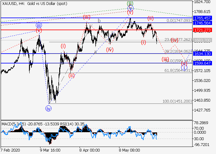 4小时图中,较高水平的上行修正已发展为波(B),波(C)已开始形成。目前,(C)的1的较低水平i的第一个入市波正在形成,其中i的波(iii)正在形成。如果假设正确,价格将会跌至1634.13–1599.64。该情况的关键止损水平为1721.27。