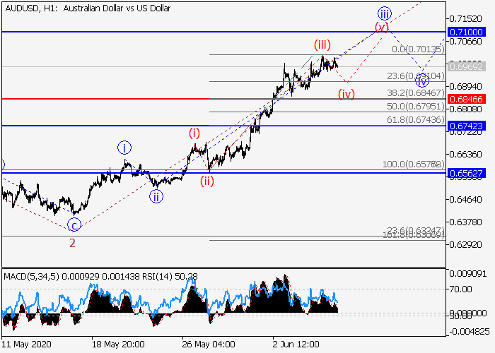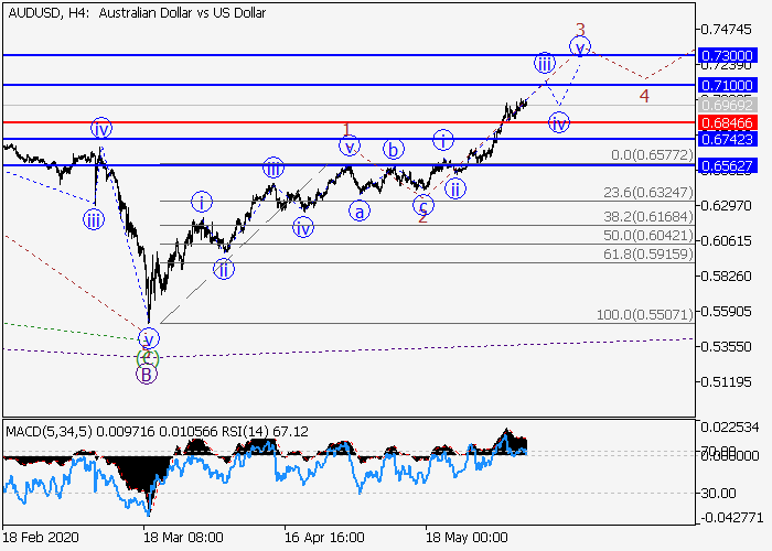 4小时图中,下行修正已发展为波B,波C已开始形成,其中C的第一波(1)形成。目前(1)的第三波3正形成,其中上行动量正发展为较低水平的3的波iii。如果假设正确,价格将会升至0.7100–0.7300。该情况的关键止损水平为0.6846。