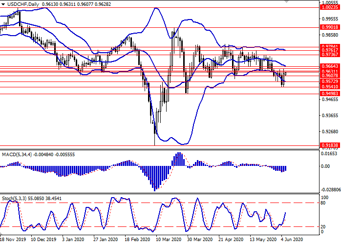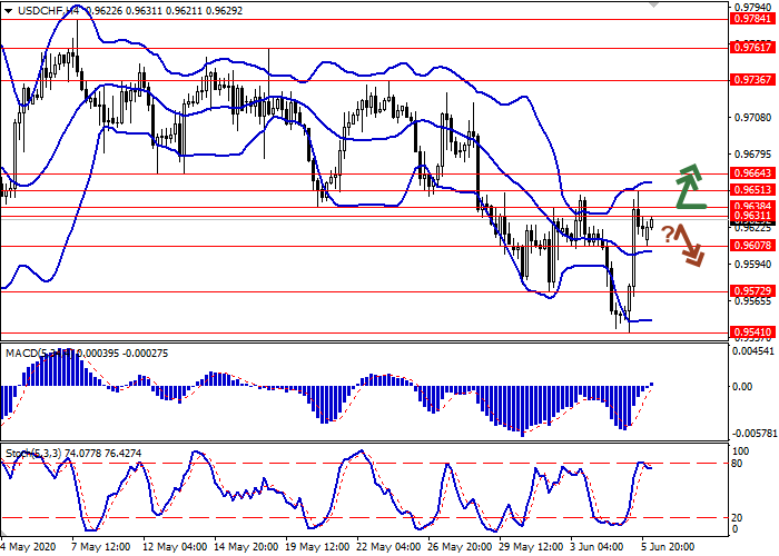 4小时图中,布林带在较大范围内盘整,短期内交易活跃。平滑异同移动平均线增长,在零线以上形成图条,并给出买入信号。随机指标跌至80%,但将会反转向上,表明超短期内呈上升趋势发展。目前,局部支持水平和抗升水平分别为0.9541和0.9651。