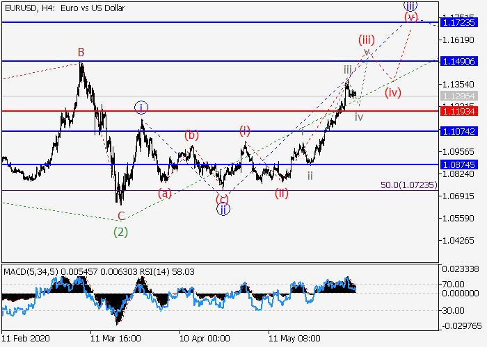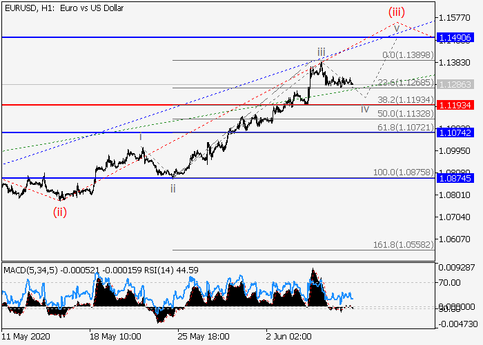 4小时图中,较高水平的下行修正已发展的波(2),波(3)已开始形成,其中,(3)的波1在发展。目前,1的iii的较低水平(iii)的第三波正在形成,其中(iii)的波iii已结束,局部修正正发展为(iii)的第四波iv。如果假设正确,修正完成后,价格将会升至 1.1490–1.1723。该情况的关键止损水平为1.1193。