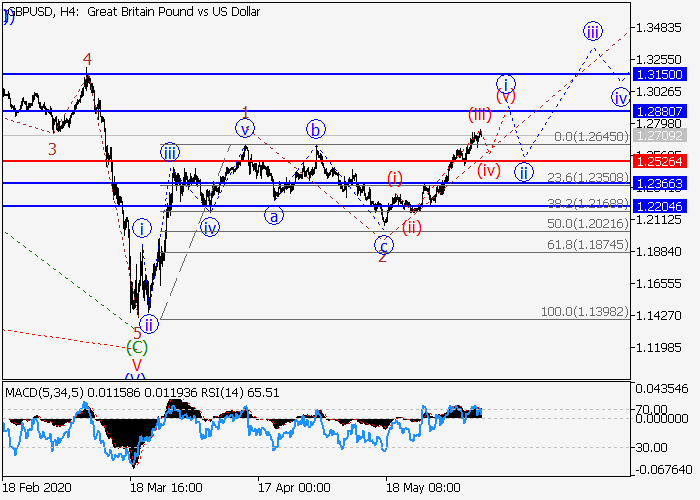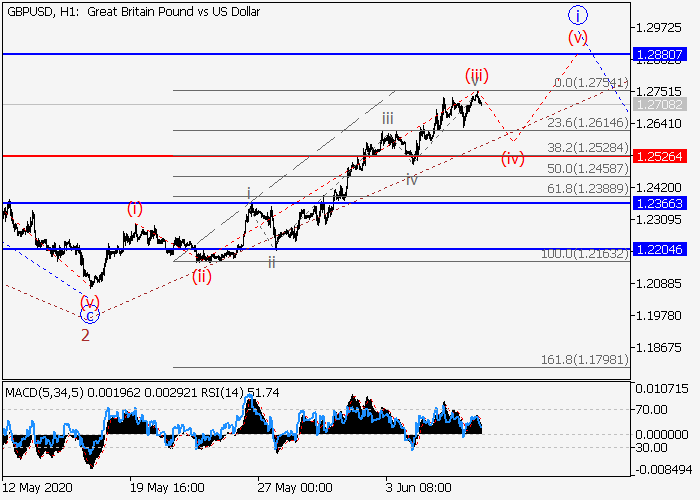 4小时图中,V的(C)的较高水平5的下行第五波已发展,第一波(1)已开始形成,其中(1)的波1已形成,(1)的波2已发展。目前,(1)的3的较低水平i的第一个入市波正在发展,其中i的波(iii)已形成。如果假设正确,i的修正(iv)结束后,价格将会升至1.2880–1.3150。该情况的关键止损水平为1.2526。