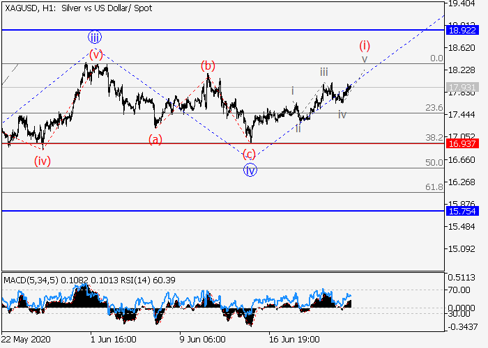 4小时图中,C的(1)的较高水平1的第一波在发展,其中1的波iii已形成。目前,局部修正已发展为1的第四波iv,1的第五波v正在形成,其中1的v的波(i)正在发展。如果假设正确,价格将会升至18.92–20.00。该情况的关键止损水平为16.93。