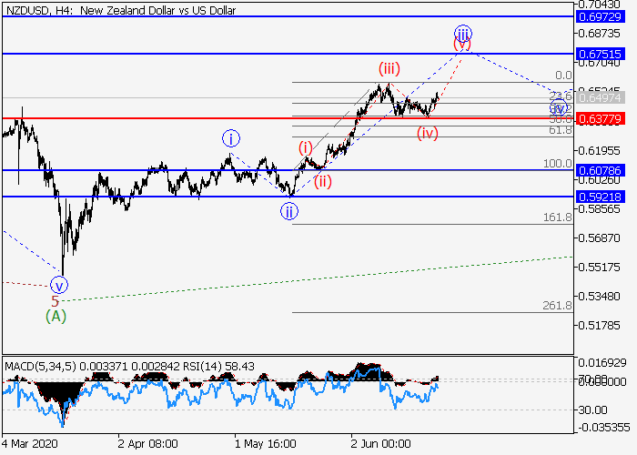 4小时图中,较高水平的波(A)已发展,上行修正已开始发展为波(B),其中(B)的波A形成。目前,A的较低水平iii的第三波正在发展,其中,局部修正已结束为iii的波(iv),iii的波(v)已开始形成。如果假设正确,价格将会升至0.6751–0.6972。该情况的关键止损水平为0.6377。