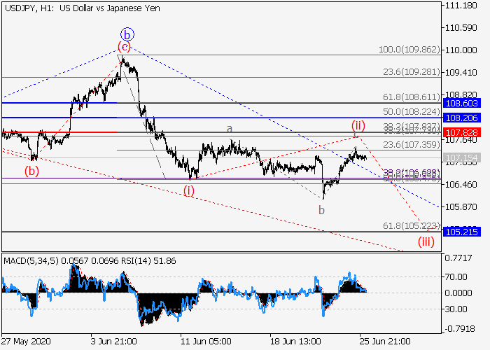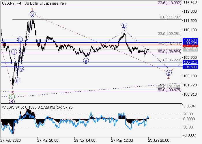 4小时图中,较高水平的上行波C发展,其中C的(1)的第一波1已形成,修正发展为(1)的波2。目前,2的波c正在发展,其中c的波(i)已形成,较低水平的局部修正已发展为c的波(ii)。如果假设正确,价格将会跌至105.21–104.50。该情况的关键止损水平为107.82。