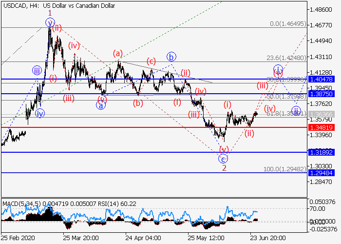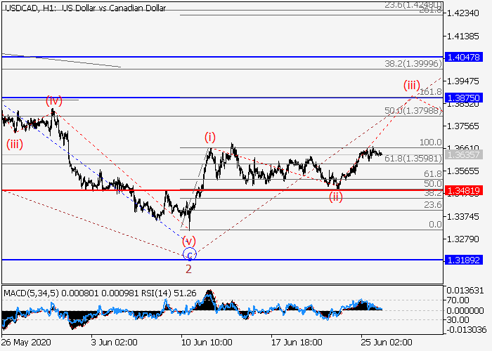 4小时图中,较高水平(3)的第三波在发展,其中下行修正已发展为(3)的第二波2。目前,(3)的波3已开始,其中3的i的较低水平(i)的第一个入市波已形成,局部修正已结束为i的波(ii)。如果假设正确,价格将会升至1.3875–1.4047。该情况的关键止损水平为1.3481。