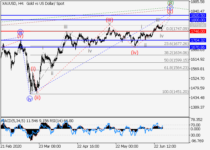 4小时图中,较高水平的上行修正发展为波(B),(B)的C的第五波v形成。目前,v的较低水平(v)的第五波正在发展,其中(v)的波iii已形成,局部修正已结束为(v)的波iv。如果假设正确,价格将会在(v)的波v中升至1800.00–1820.50。该情况的关键止损水平为1746.00。