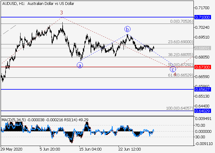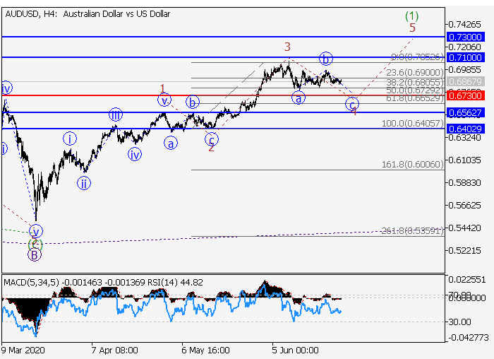 4小时图中,C的较高水平(1)的第一波在发展,其中,(1)的博已形成。目前,局部修正正发展为(1)的博4,其中4的波c正形成。如果假设正确,修正结束后,价格将会升至0.7100–0.7300。该情况的关键止损水平为0.6730。