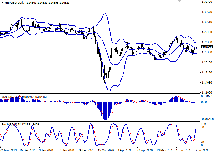 日线图上,布林带水平反转。价格区间由上收窄,反映出短期内出现平稳的交易动态。平滑异同移动平均线增长,保持较强买入信号(图柱位于信号线之上),并试图在零线之上盘整。随机指标增长,但迅速接近高点,这表明英镑可能在超短期内超买。