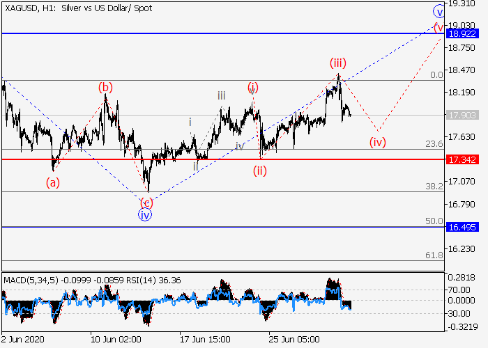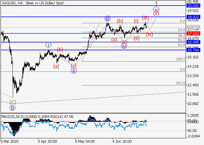 4小时图中,C的(1)的较高水平1的第一波在发展,其中1的波v形成。目前,v的较低水平(iii)的第三波已发展,局部修正正形成为v的波(iv)。如果假设正确,修正结束后,价格将会升至18.92–20.00。该情况的关键止损水平为17.34。