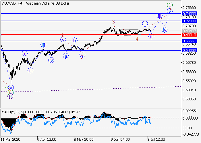 4小时图中,C的较高水平(1)的第一波在发展,其中局部修正已发展为(1)的第四波4,呈三角形。目前,(1)的第五波5已开始形成,其中5的局部修正ii正结束。如果假设正确,价格将会升至0.7200–0.7400。该情况的关键止损水平为0.6831。