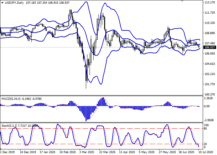 日线图中,布林带在水平面上反转。价格区间几乎保持不变,反映出短期内交易的模糊性。平滑异同移动平均线指标下降,保持弱卖出信号(图柱位于信号线以下)。随机指数保持坚定下降趋势,但正迅速接近其低点,这表明该工具可能在超短期内超卖。