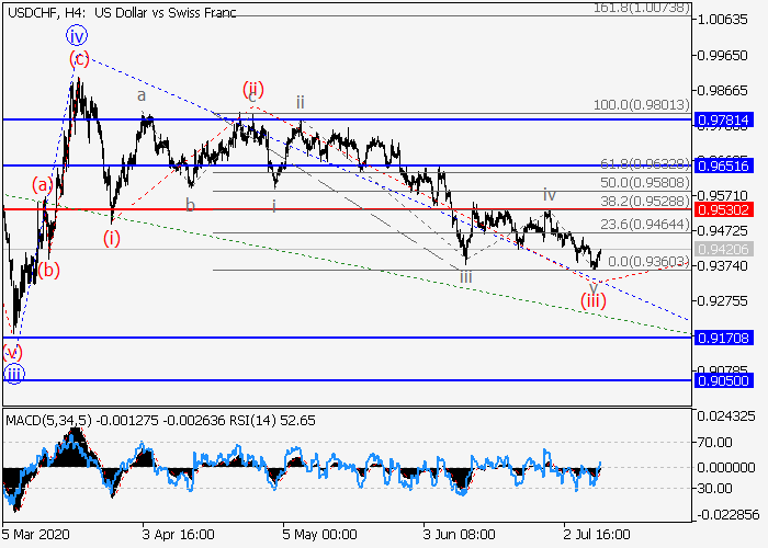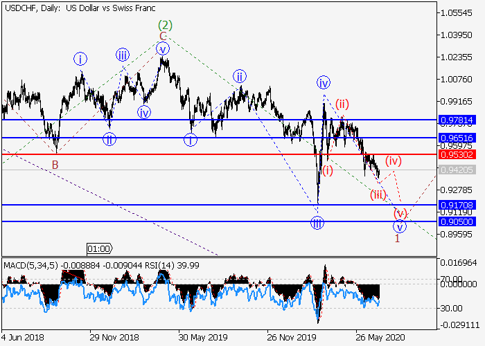 日线图中,较高水平(3)的第三波在发展,其中(3)的波1形成。目前,1的较低水平v的第五波正在发展,其中v的波(iii)已形成。如果假设正确,v的局部修正(iv)结束后,该货币对将会跌至0.9170–0.9050。该情况的关键止损水平为0.9530。