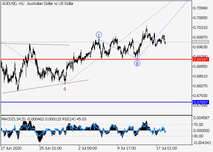 4小时图中,C的较高水平(1)的第一波在发展,其中局部修正已发展为(1)的第四波4。目前,(1)的第五波5已开始形成,其中5的修正波ii已结束,5的第三波iii正在发展。如果假设争取,价格将会升至0.7200–0.7400。该情况的关键止损水平为0.6918。