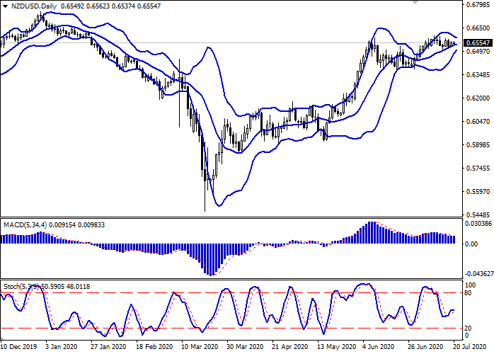 日线图上,布林带呈横盘走势。价格范围在相当狭窄的范围内盘整,反映了短期内交易动态模糊。平滑异同移动平均线指标正在增长,保持弱买入信号(图柱位于信号线上方)。随机指数在短暂下跌后也反转上行,对上周交易的看涨收盘作出反应。