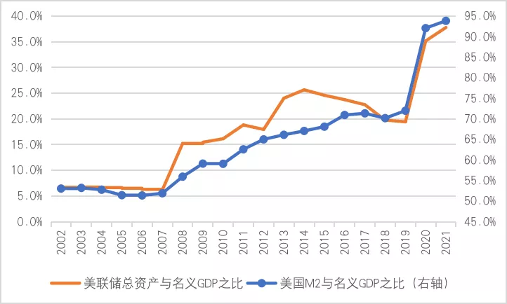 图2:美联储总资产及美国M2与名义GDP之比(单位:%)