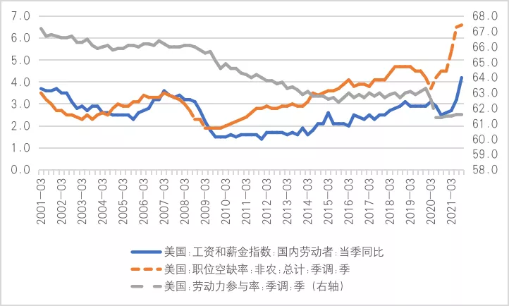 截至9月份,美国劳动参与率为61.6%,较2019年底仍低了1.7个百分点。三季度,美国国内劳动者薪资同比增长4.2%,连续四个季度同比上涨,涨幅也是过去二十年来的新高。