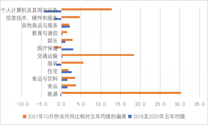 图1:2021年10月份美国CPI分项同比变动相对于过去五年均值的偏离(单位:%)