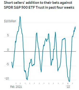 根据技术和数据分析公司S3 Partners的估算,在截至上周四收盘的四周时间里,标普500ETF信托(SPDR S&P 500 ETF)的空头头寸增加了86亿美元,这是截至2021年3月初的四周以来的最大增量。