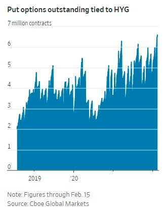 巴克莱的数据显示,高收益率债ETF,即iShares iBoxx $ High Yield Corporate Bond ETF(HYG)和投资级债ETF,即iShares iBoxx $ Investment Grade Corporate Bond ETF(LQD)的未平仓看跌期权数量最近均跃升至有纪录以来的最高水平。