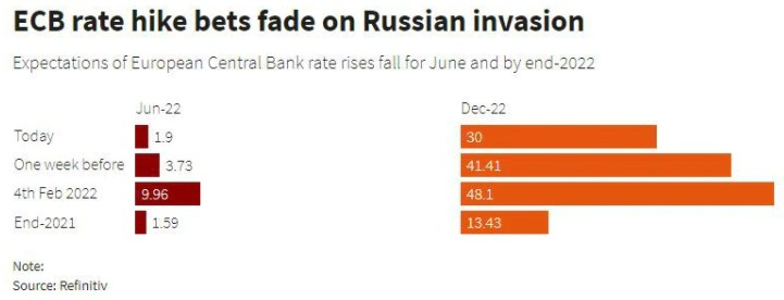 市场对美联储、英国央行和欧洲央行等激进加息的押注在过去一周已经消退。但周一,市场预期进一步降温,主要是由于欧美对俄罗斯的更严厉制裁,包括禁止部分俄罗斯银行使用SWIFT全球支付系统将打击市场稳定,以及油价飙升将损及欧元区经济,货币市场愈发相信欧洲央行将更晚收紧政策。