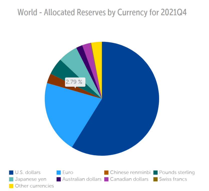 数据显示,去年第四季度,人民币在全球外汇储备中的占比,由去年三季度的2.66%升至2.79%,位居全球第五位。这也是IMF自2016年开始公布人民币储备资产以来的最高水平。不过,目前美元仍是全球主要央行持有规模最大的储备货币,占比为58.81%。