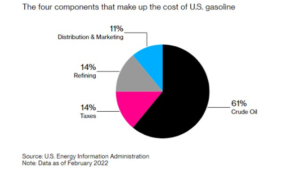 在线客服创纪录的高油价使美国民众饱受“加油之痛”,而其根本原因是原油飙升,但这还不是全部。根据美国能源信息署(EIA)数据显示,原油价格实际上仅占2022年汽油平均零售成本的61%。相比之下,2021年的比例为53.6%,自2012年以来的平均比例为54.8%。除此之外,还有税收成本、精炼成本、分销和营销成本。