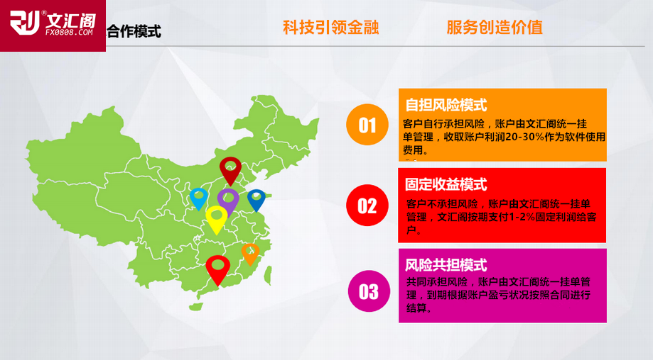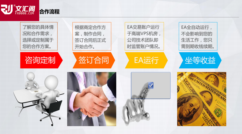 文汇阁智能系统:一站式EA交易技术服务商 我们提供全套ea服务,确可以让您账户稳定增长,所以文汇阁是一个提供整套外汇交易技术解决方案的服务商. 如果你是一个理财公司、或经纪人或者投资人,自己的交易团队技术还不够稳健、需要技术团队进行合作,那与我们全方位的合作符合你的最大的利益. 为什么要加入我们 金融行业是非常专业的行业,外汇投资又是金融行业中最专业的品种.没有任何一个人可以既做好营销,又做好技术.只有合作,才能在该行业越做越好,做大做强 .资本市场最缺的是技术,稳定盈利的技术,从来不缺资金,而我们的优势就在于技术稳健,所以只要账户稳定盈利,让客户找你,而不是你找客户. 在外汇行业十余年,见过太多太多带着梦想进入外汇市场,确带着失望悄然离开的同仁,也见过太多投资公司从设立到辉煌,最后清算,甚至挑战法律最后失去自由的人,外汇行业的潜在利润使得只要进入这个行业之后再也不愿意离开。但是这个行业的专业性非常强,并且近5年来,外汇行业在各国都开始规范起来,美国NFA,英国FSA都给予了非常重视的监管力度,越往后发展,专业性越发显得重要。我们始终认为要在金融行业有所发展必须是以客户利益为中心,客户服务做到位,但目前国内99%的外汇公司将服务停留在表面,提供的是培训服务,提供的是喊单服务等等,没法提供完整交易策略给客户,而客户自身不够专业,必须有强有力的技术支持,客户才有可能在这个投资市场盈利。如果客户保持稳健盈利,外汇公司才会越做越顺越做越大,客户越来越多。如果客户不盈利,公司面临的是员工离职,客户流失,公司收益日渐降低,最后只能歇业。任何的喊单、任何的汇评、任何的培训都只是停留在把客户当学生的阶段,尽管客户努力学习依然改变不了亏损的结局,必须抓住本质,提供给客户切实可行的、稳健的盈利技术解决方案。 与我们合作的意义在于,您完全可以把有限都是时间精力投注于市场开发及客户维护,账户交易的事情我们进行全面的安排. 最终实现市场在口碑相传之下快速增长,变被动营销为主动,等待客户慕名上门开户的场面.
